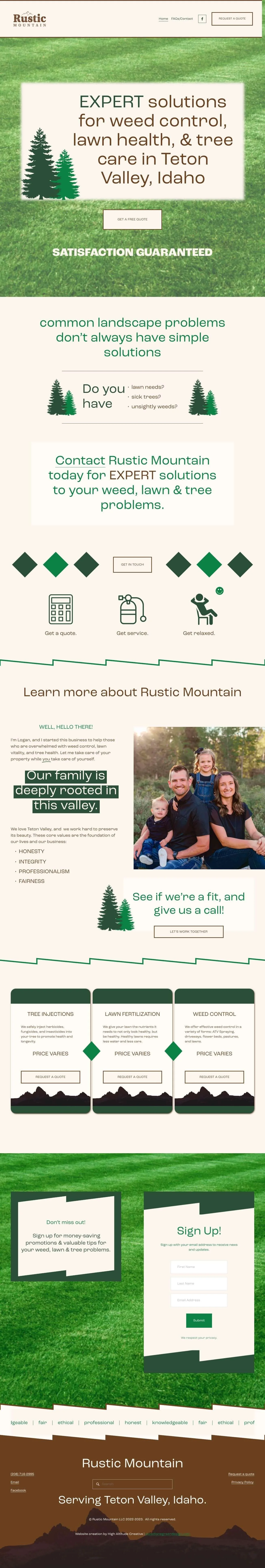 Rustic Mountain is a weed control, lawn health, and tree health business in Teton Valley, Idaho. As a new business, they wanted a small, affordable website that would showcase their services, demonstrate their investment in the community, and provide potential clients with a way to inquire about Rustic Mountain’s services. Rustic Mountain requested that their website reflect natural earth tones, like greens and browns.